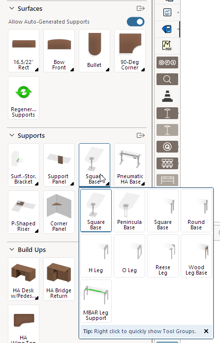 With our recent update to our UI we are taking advantage of a new function that Configura has given us to reduce the amount of scrolling in our extensions. If you see an icon with a black arrow in the lower right corner you can click on that arrow or right click on the icon and it will 'fly out' showing the other items in that category: